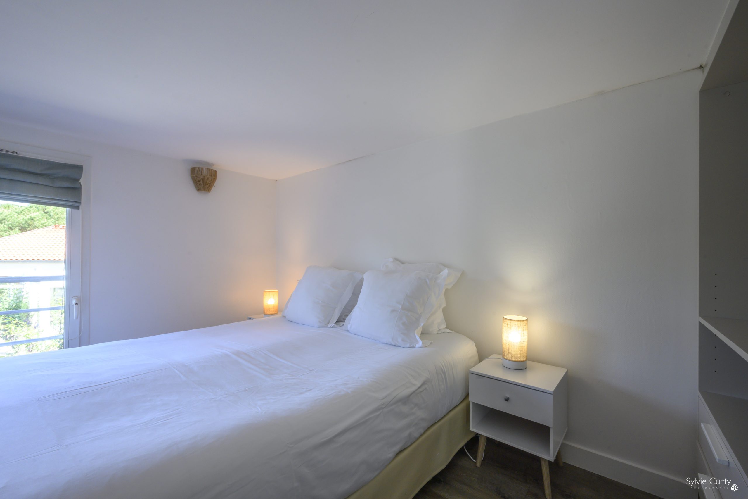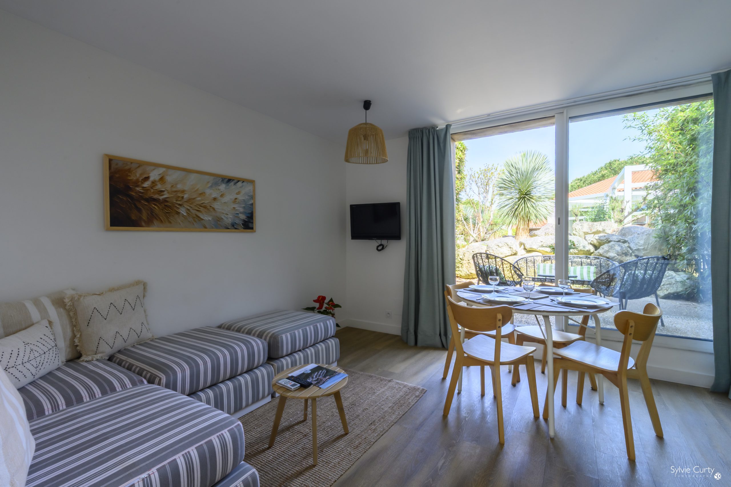 A large bay window opens onto a private terrace.