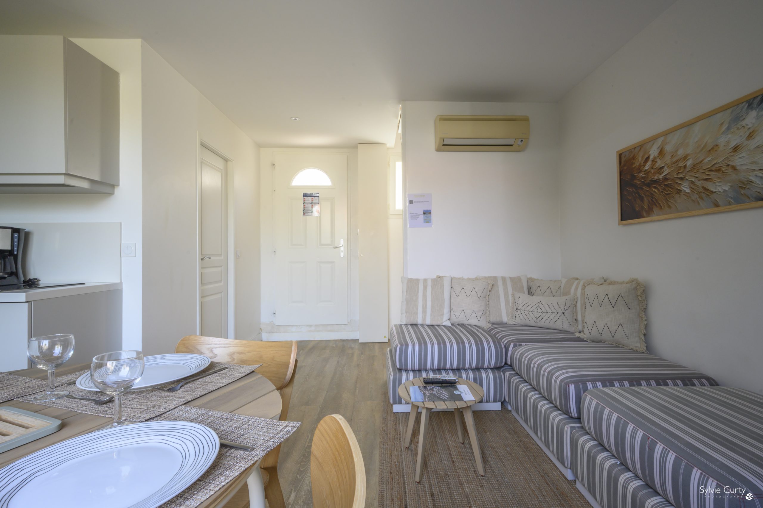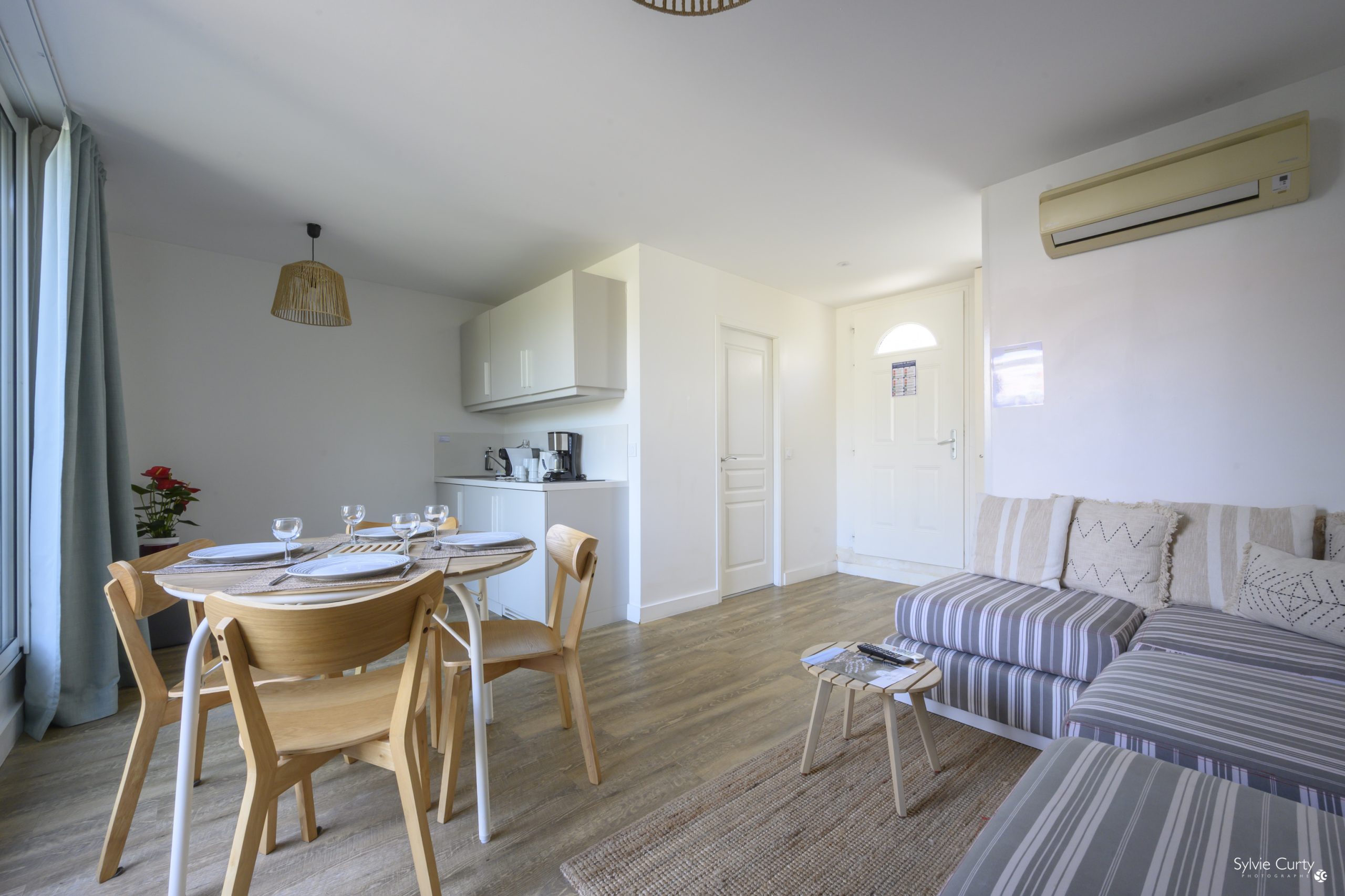 50 m², 3-room duplex house for up to 4 people, comprising a living room, equipped kitchenette and shower room with walk-in shower and toilet on the first floor. A spiral staircase leads upstairs to 2 bedrooms and a toilet.